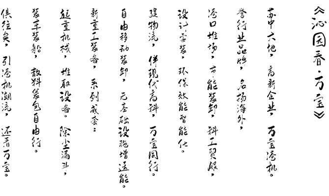量身定制,港口、堆場(chǎng),散體和粉體物料,裝船、堆高、輸送設(shè)備,工藝設(shè)計(jì)、設(shè)備制造 和安裝調(diào)試。提供整體解決方案和技術(shù)支持。提供全新的港口裝卸理念,輕松擴(kuò)大港口經(jīng)營范圍。